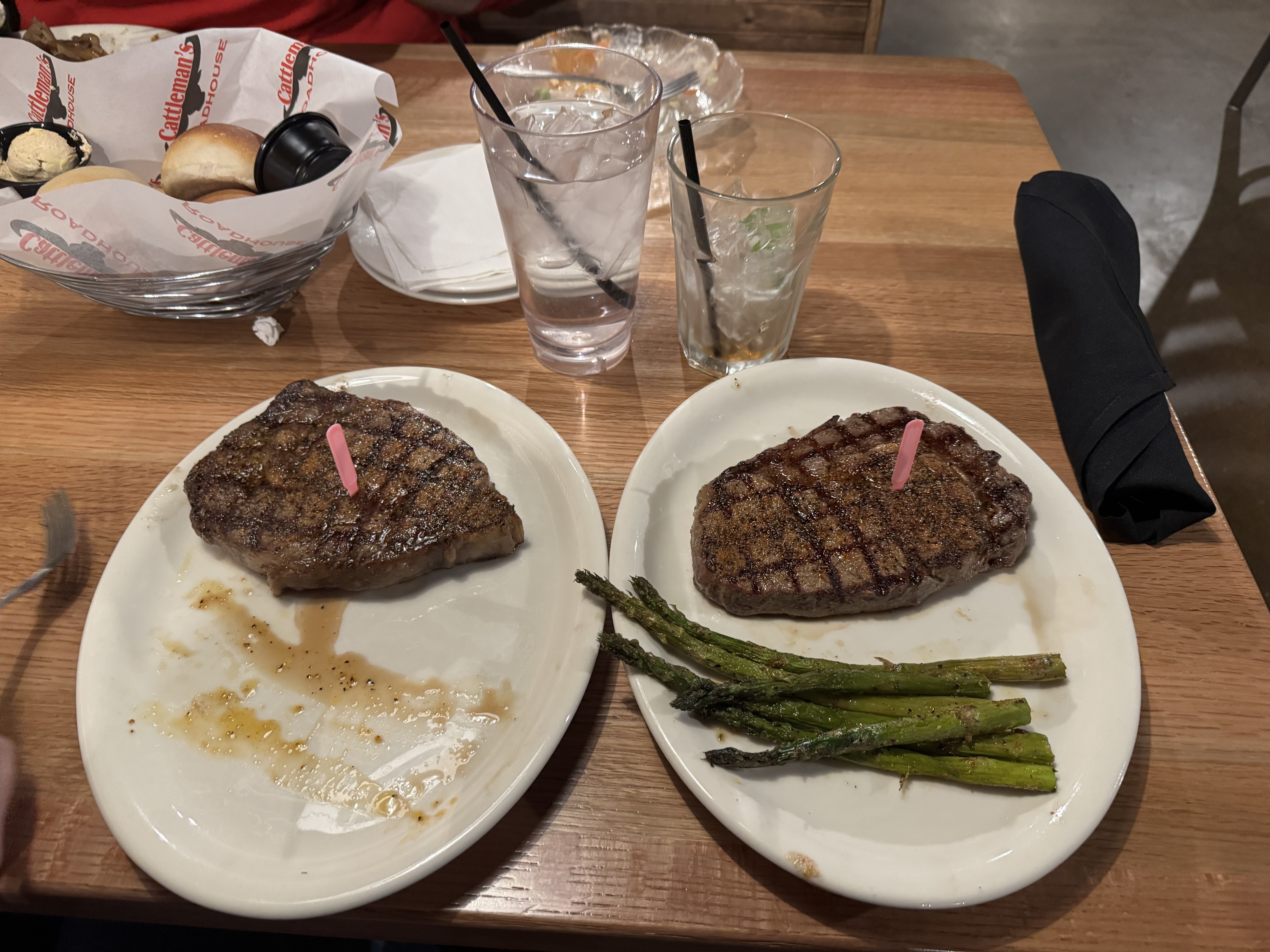 My two 16 oz ribeyes, pre cooked weight of course. @The_CINC has already absconded with the asparagus. The other helping of asparagus I gave to ‘Baby Sis’.