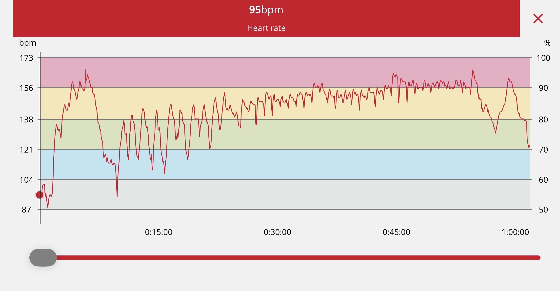 Two days ago, I got my heart rate up to 177. My Polar exercise app asked if I wanted to increase my maximum heart rate to 177 from 173.