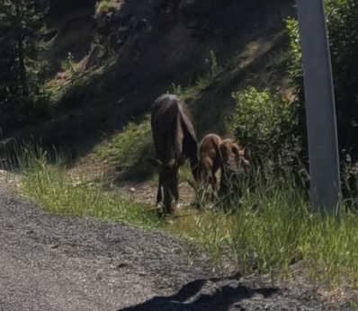 As we crossed into Idaho, at the summit of the pass, we were coming around a turn at 50 MPH, and in the right ditch we saw this. A Mama moose and a set of twin calves, scared the crap out of us and the Moose.