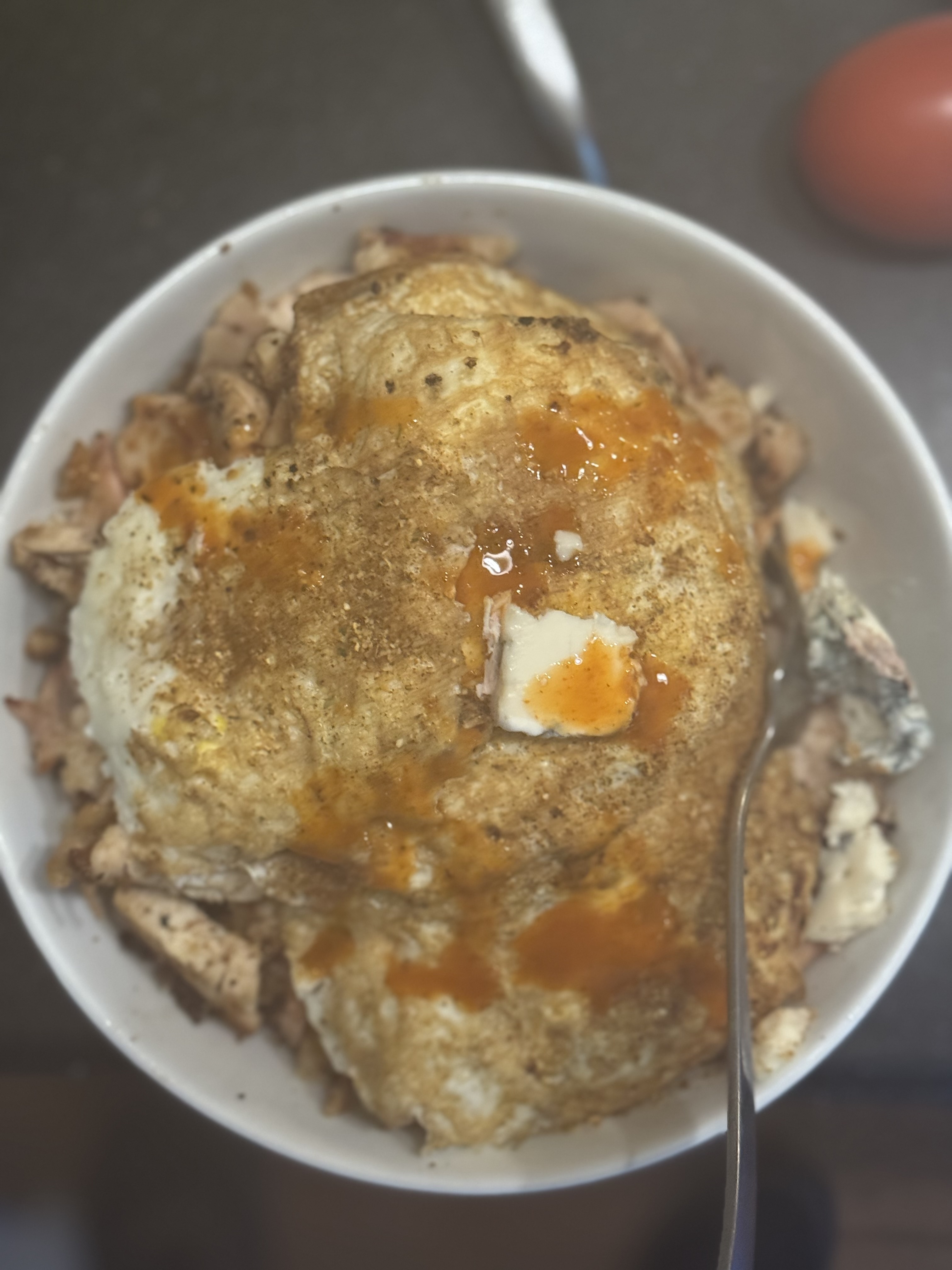 There’s a chunk of Roquefort on top, and on the right. It will all be mixed in.