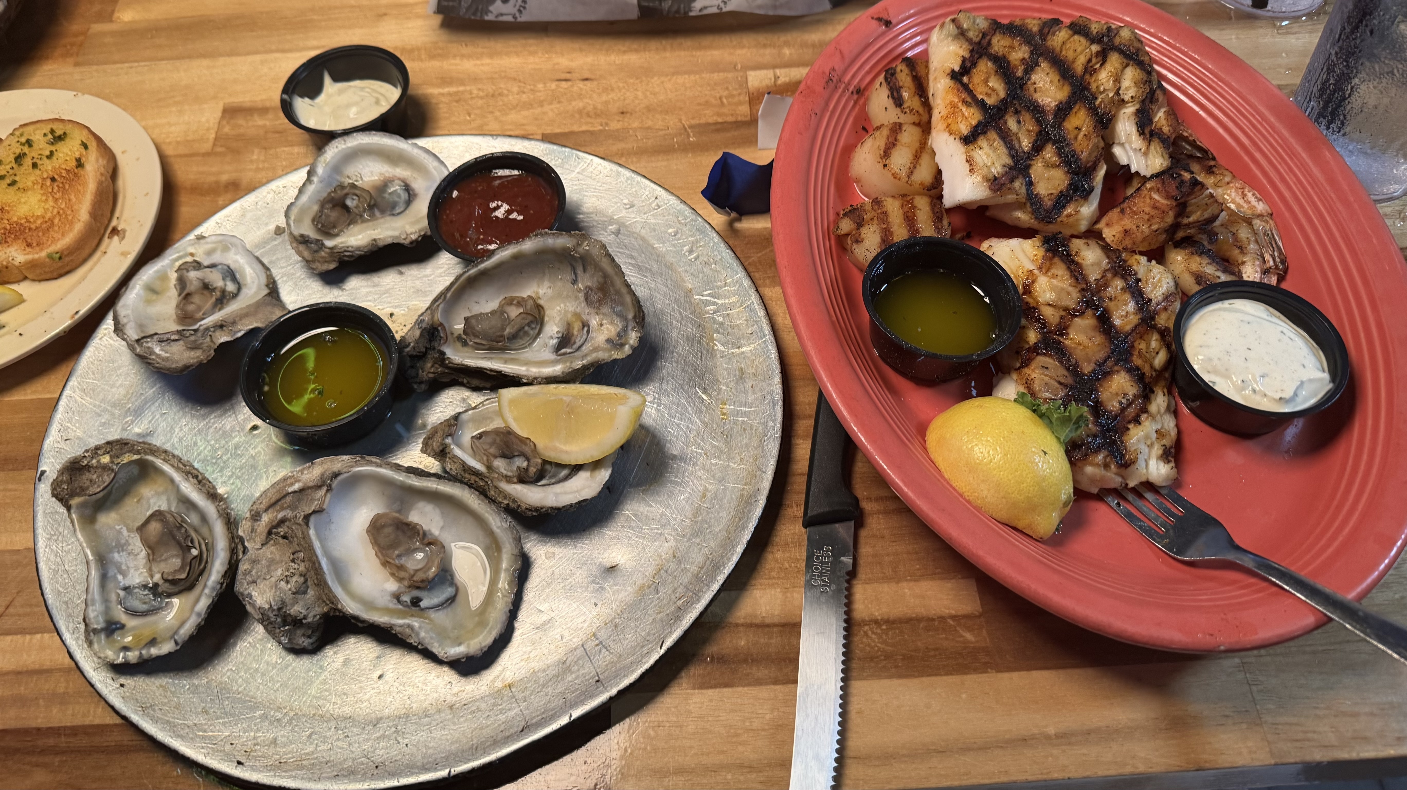 Mixed seafood grill, scallops, and shrimp, with 28 ozs of Grouper.