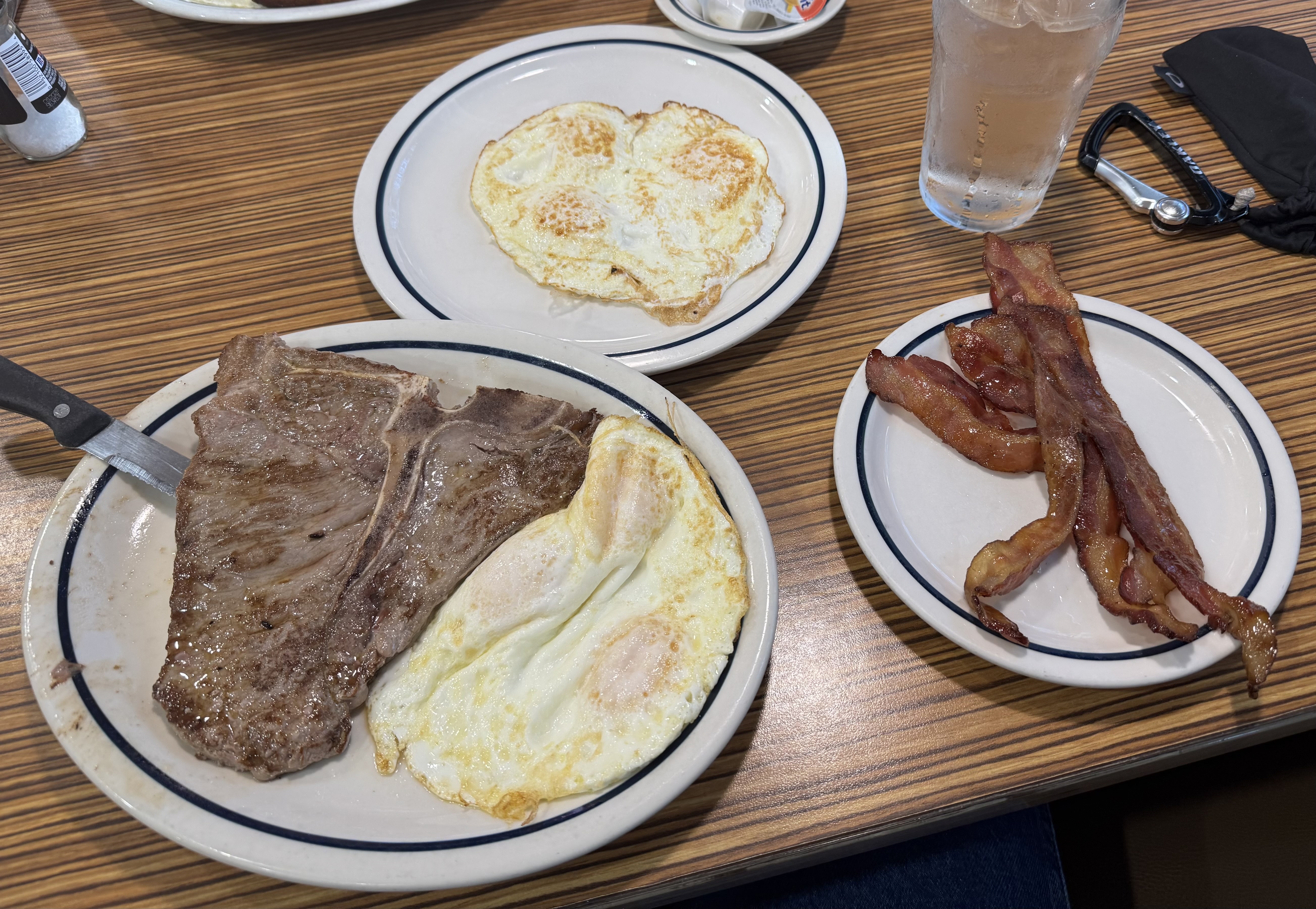 I’m getting a bad steak (it’s IHOP after all), 6 eggs, and 4 slices of bacon.