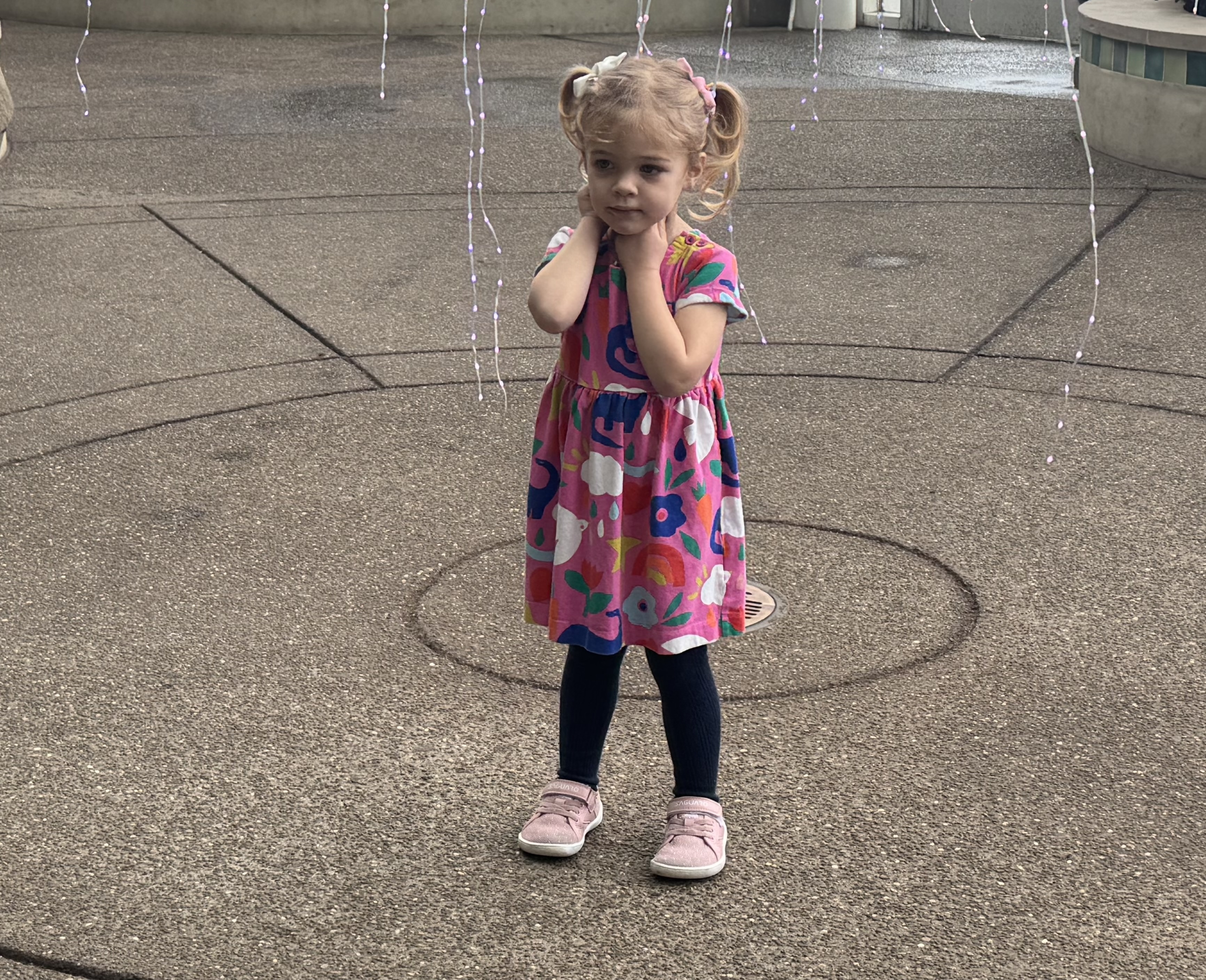 I stood up “Excuse me?!?” She pointed to the elevator lobby behind her.
