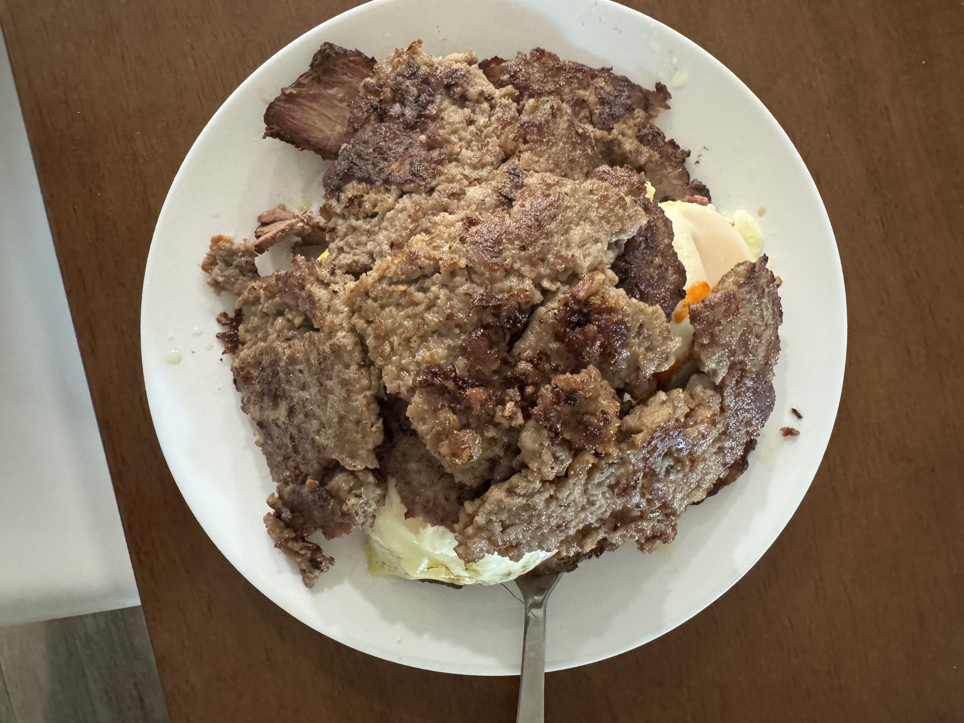 1. Eggs and hot sauce over brisket